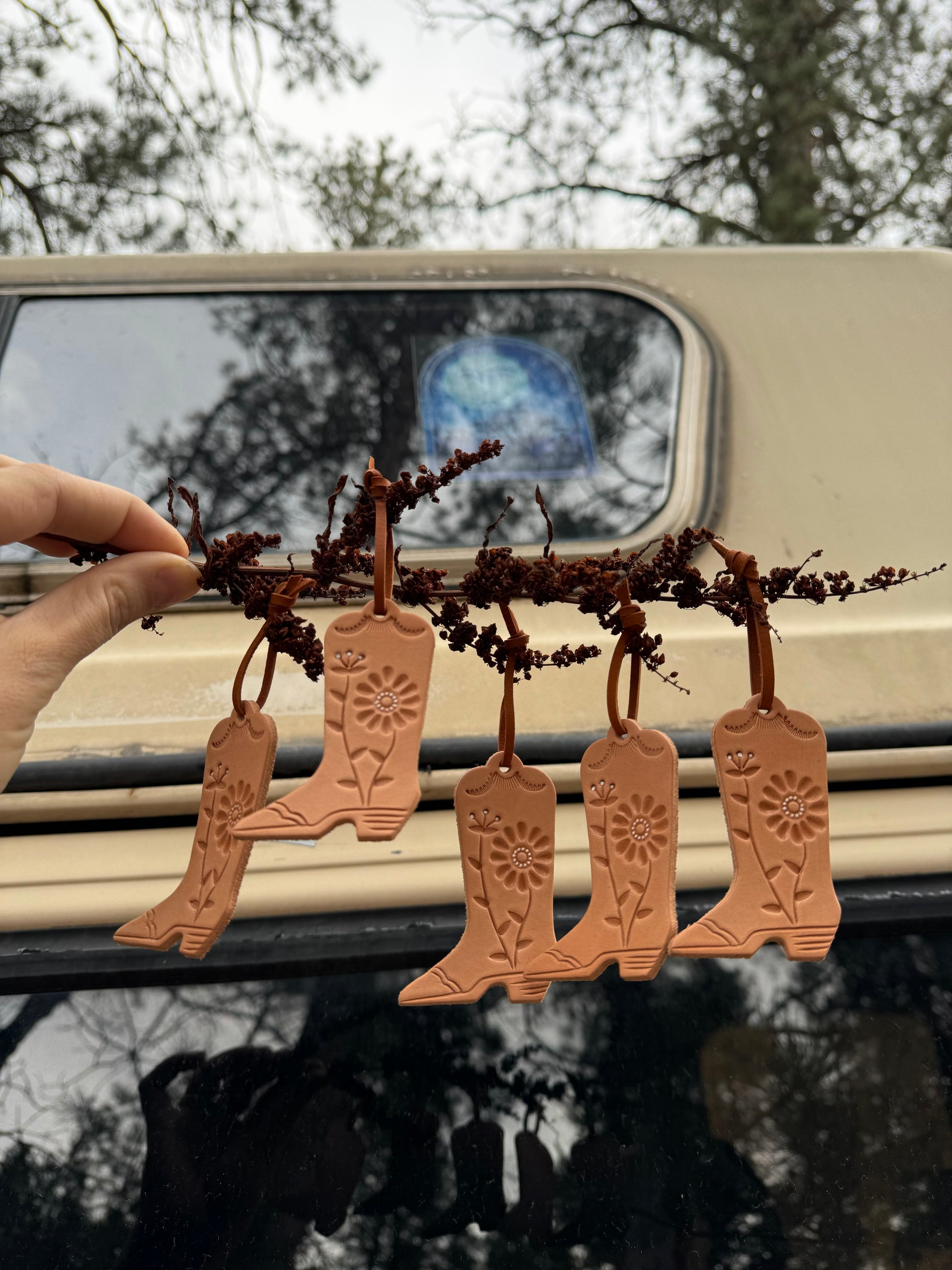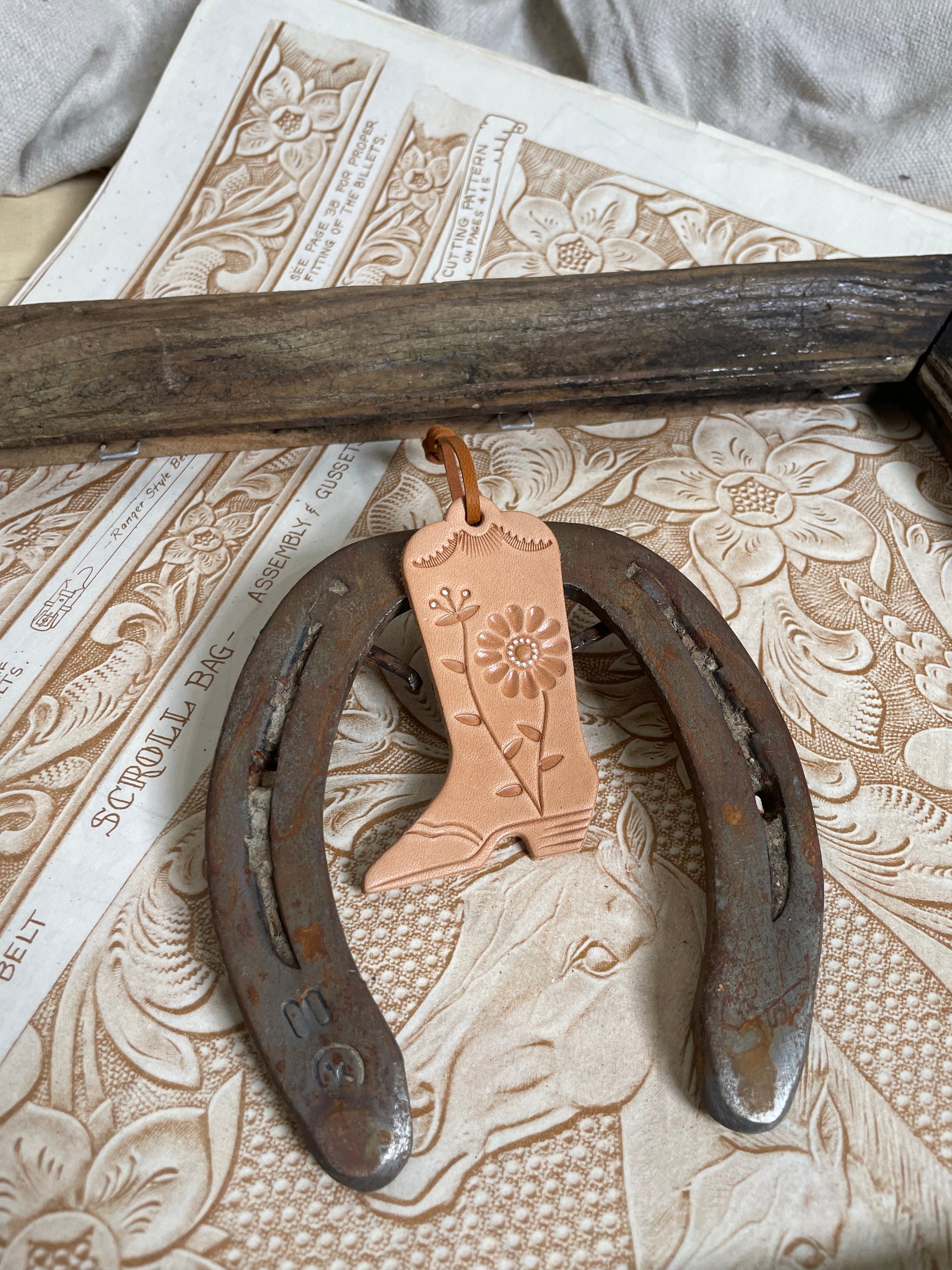 This ornament is made from US tanned leather. It is hand stamped and hand painted. Finished with high grade deer skin lace.